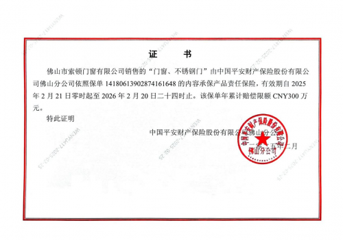 推拉窗质量不达标容易发生意外,业主恐怕要承担高额的赔偿责任,为了安全起见,除了选择合格的产品外,还建议选择有产品责任险的厂家。像推拉窗厂家索顿门窗与保险公司合作,大额承保产品责任险,如果因为产品质量问题而在意外中导致财产损失的,经过鉴定只要在理赔范围内都可以获得赔偿,这样就给业主用户提供一道安全保障,避免重大损失。